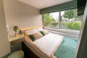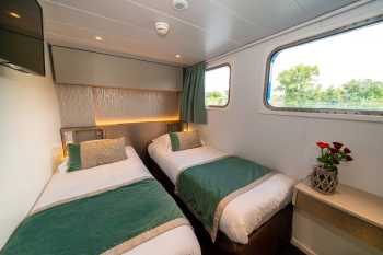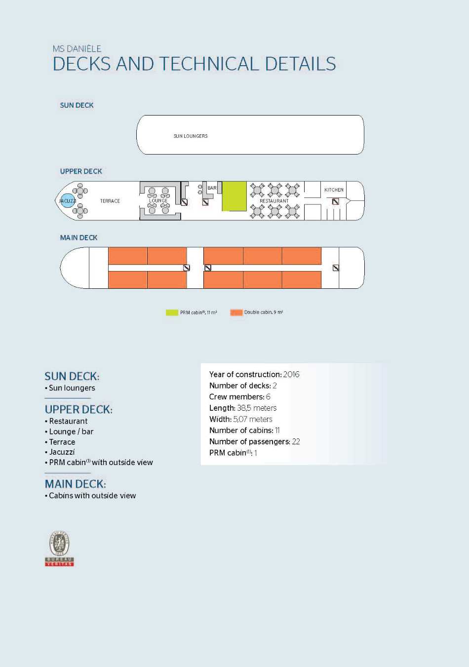 The MS Danièle is a superb Premium canal barge, measuring 38,50 meters long and 5,07 meters wide. It can accommodate 22 passengers, in 11 cabins offering amenities and providing guests with all the comforts they need during their stay. On board, everything has been taken care of down to the smallest detail with crew members to guarantee a personalized service. The decoration creates a particularly soft and welcoming atmosphere. Located on the upper deck are the restaurant, which offers delicate cuisine in a refined setting, the lounge bar and a relaxation area with a jacuzzi. Comfortable sun loungers are provided on the sun deck, the ideal place to relax and admire the surrounding landscapes.